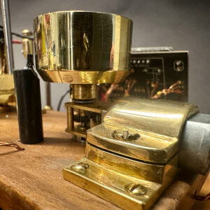 The base of the machine is made from a solid solid slab of FSC-controlled American Walnut. This is my favorite type of wood due to its warm color and its excellent machining properties. It’s basically round with a quarter circle appendix for the few controls of the machine. A glass dome protects the machine from dust and fingerprints.