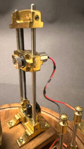 The lead screw on the N20 motor is a metric M4 size, for which I had the thread taps readily available. I decided to expose the leads of the laser and connect them to two clearly visible poles. This way I didn’t need a fancy way of conducting the energy with sliding contact points. And it doesn’t detract from the overall aesthetic.